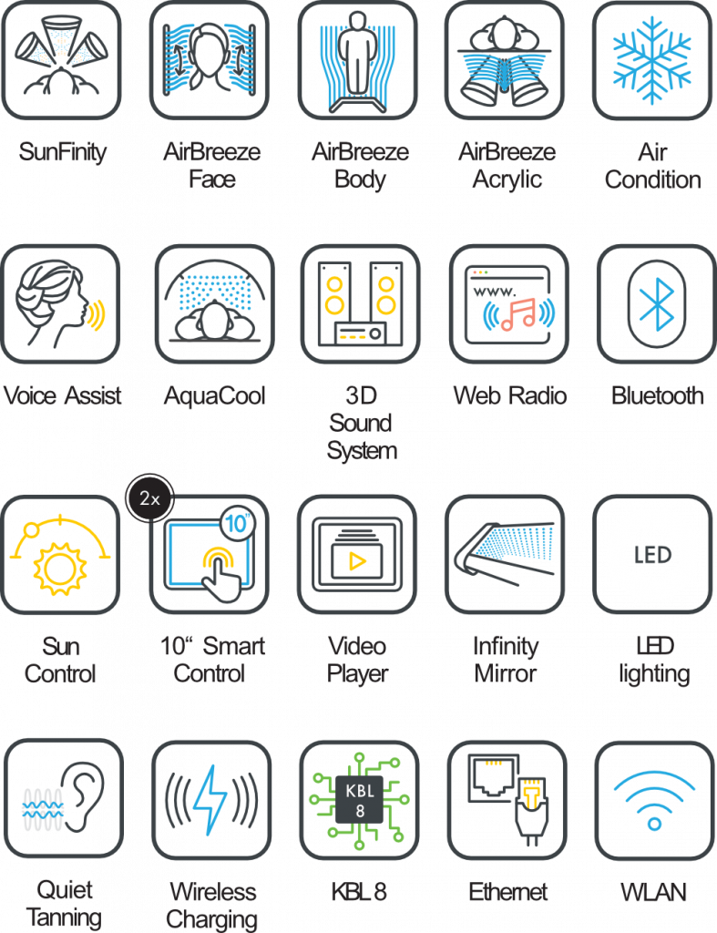 Modernste Technologie, außergewöhnlicher Komfort und ein Bräunungserlebnis der Extraklasse. Das Megasun K11 Air setzt völlig neue Maßstäbe. Genieße eine sanfte, gleichmäßige Bräune und pure Entspannung in einem Solarium, das Design, Power und Wellness perfekt vereint.